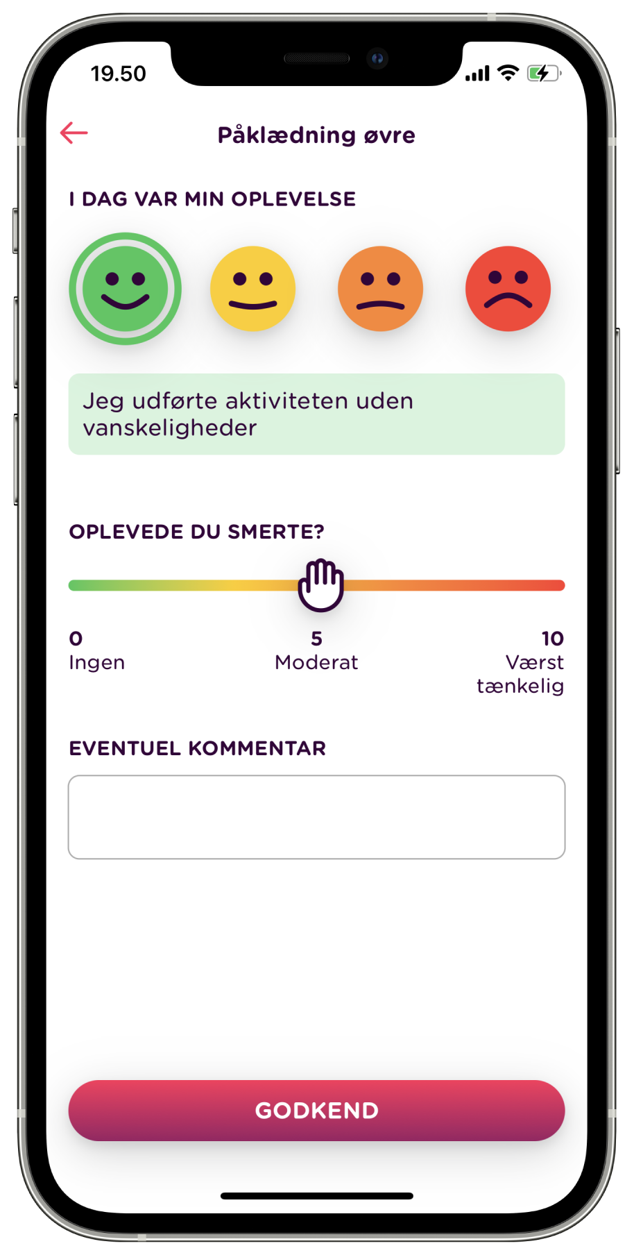 - Individuel tilbagemelding via beskeder, smerteskala og selvrapporterede oplevelser